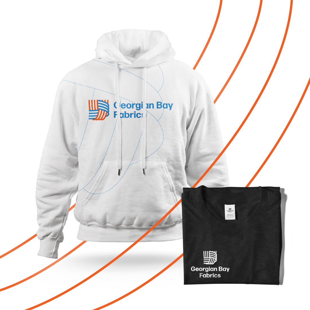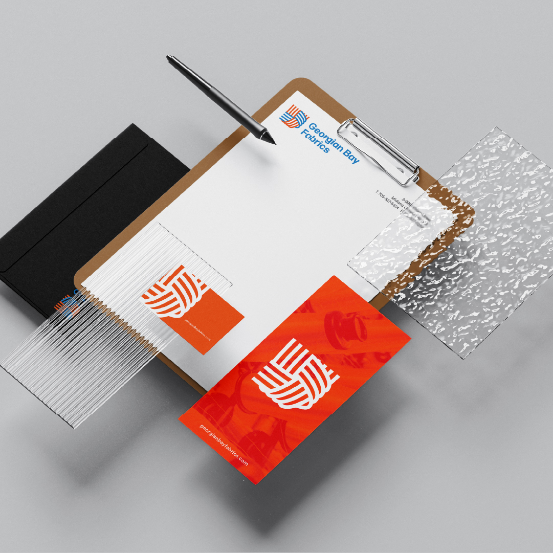 Georgian Bay Fabrics is a proudly Canadian-owned manufacturer of high-quality fibreglass woven tape. The brand draws inspiration from the intricate beauty of the product in production and when examined up close. We also wove three main ideas into the brand. Connection The logo emphasizes strong connections, both as a product and company ethos. The threads coming together creates an interlocking of hands, forming the real strength of the brand… its people. Family/Company History The colours and shapes were heavily influenced and inspired by the owner’s Dutch family heritage. The orange and blue are a nod to the Netherland flag. Nature With their location and love for the Georgian Bay region, we imagined the threads as waves, the blue, as water, and the orange emulating the setting sun.